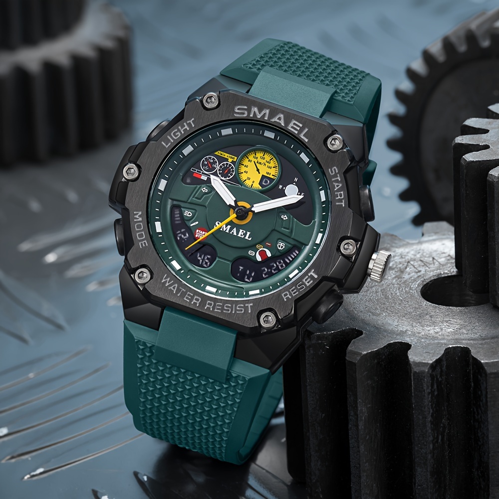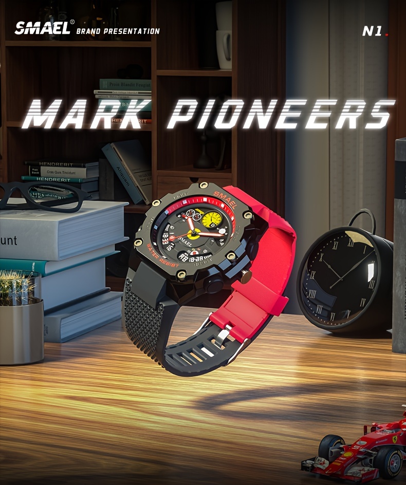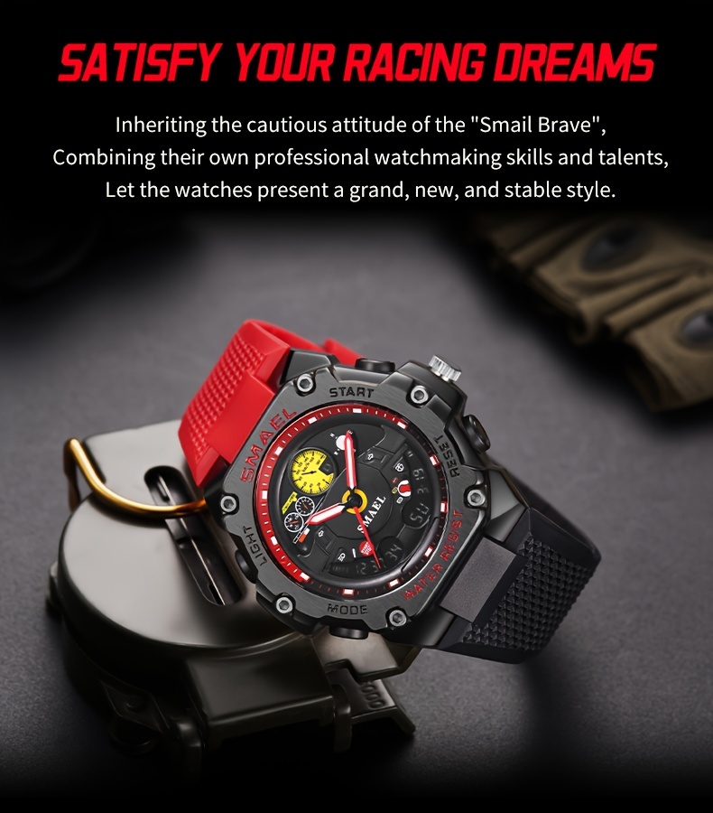 Elevate your outdoor experience with the SMAEL Racing Dashboard Sports Watch, built for adventure, durability, and precision. Featuring a Quartz + Digital movement, 5ATM water resistance, and a rugged polygonal dial design, this watch is perfect for sports enthusiasts and explorers.